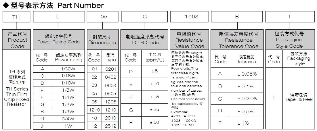 風華高科高穩定性薄膜片式固定電阻器 - TH 系列型號命名規則: