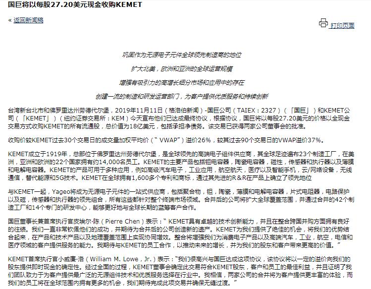 根據(jù)基美官網(wǎng)披露的消息,該交易預(yù)計將在2020年下半年完成,但要符合慣例完成條件并獲得所需的監(jiān)管批準(zhǔn),交易完成后,基美將成為國巨的全資子公司