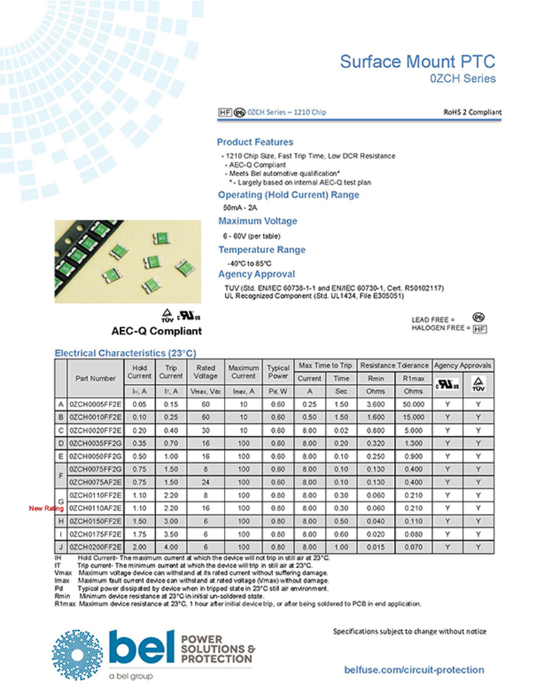 說明獨特的Bel(Bel)溫度保護裝置,增加了正溫度系數可復位功能,輕薄,SMT封裝。與我們的傳統保險絲產品系列相似,我們的可復位保險絲防止有害的過電流和短路情況。然而,我們的PTC設備也可以用來保護防止過溫條件不一定由過電流引起。Bel的PTC設備在通電后會復位電路被移除,故障被清除,電路重新通電。這種可復位保護電子設備保持完全功能,無需維修人員更換保險絲。