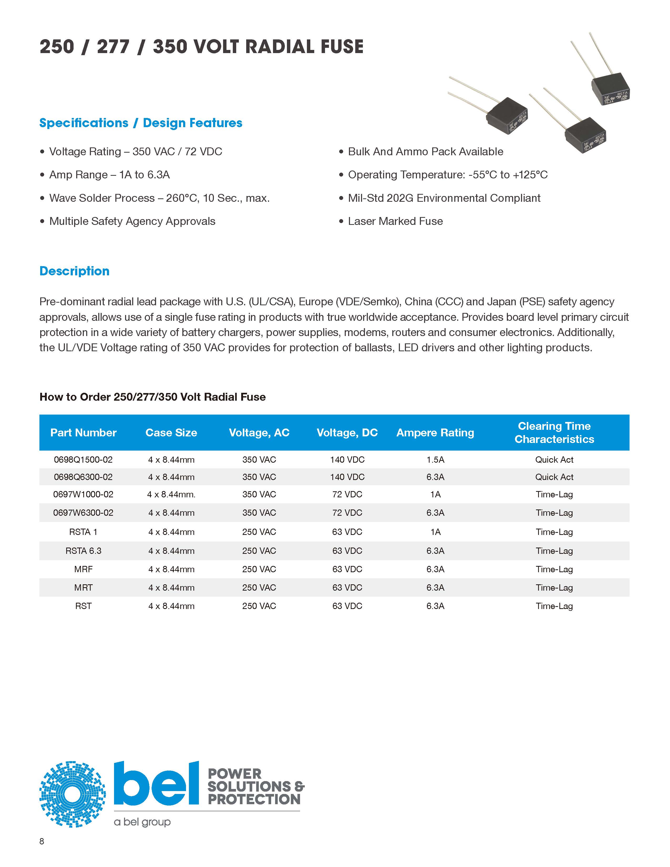 塑料主體和徑向引線保險絲 經(jīng)美國(UL / CSA),歐洲(VDE / Semko),中國(CCC)和日本(PSE)安全機(jī)構(gòu)批準(zhǔn),允許在真正被全球接受的產(chǎn)品中使用單個熔斷器額定值。在各種電池充電器,電源,調(diào)制解調(diào)器,路由器,消費(fèi)類電子產(chǎn)品等中提供板級主電路保護(hù)。