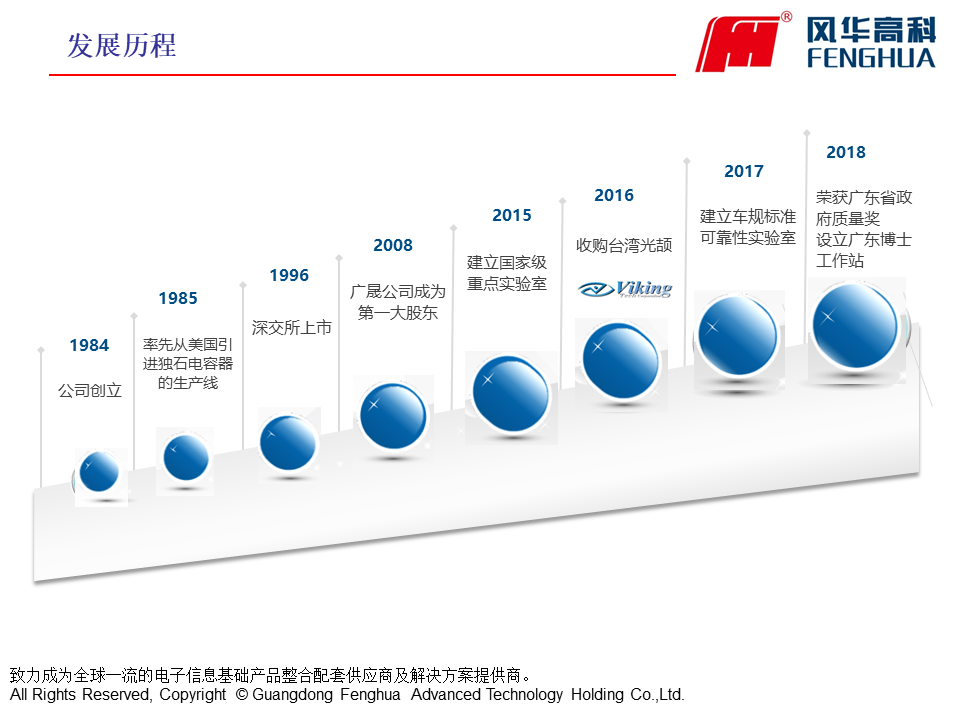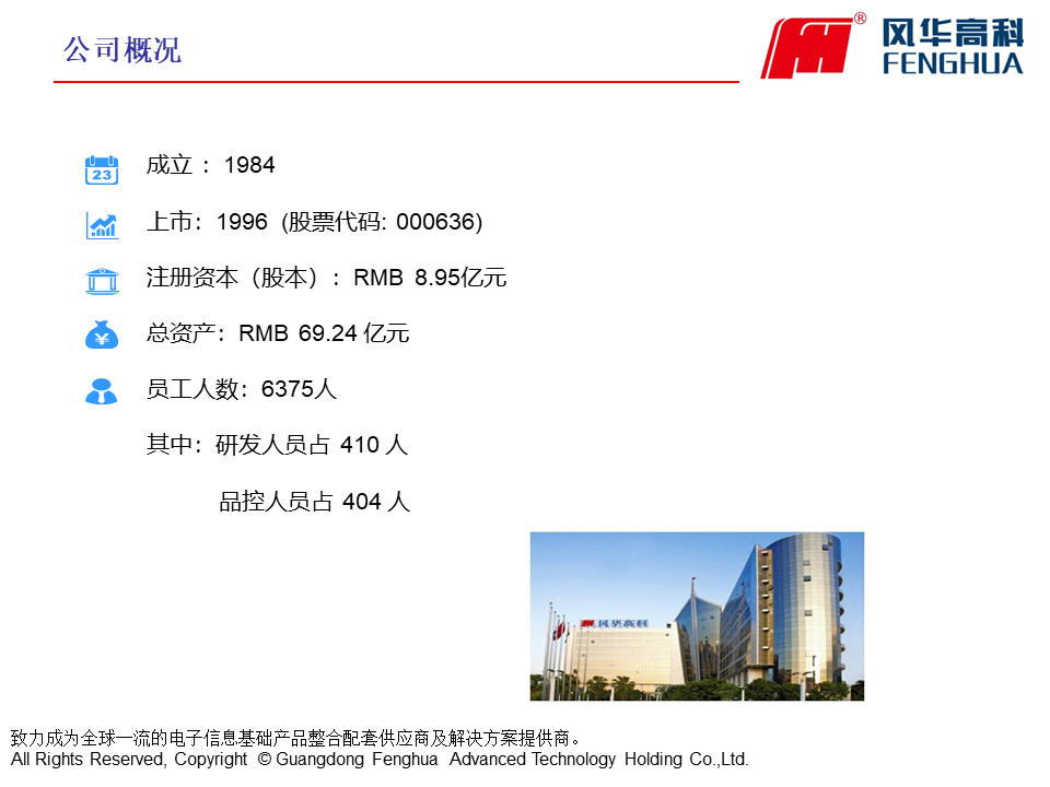 廣東風華高新科技股份有限公司(證券簡稱風華高科,證券代碼000636)成立于1984年,是一家專業(yè)從事高端新型元器件、電子材料、電子專用設備等電子信息基礎產(chǎn)品的高新技術企業(yè),1996年在深圳證券交易所掛牌上市。風華高科自進入電子元器件行業(yè)以來,實現(xiàn)了跨越式的發(fā)展,現(xiàn)已成為國內(nèi)最大的新型元器件及電子信息基礎產(chǎn)品科研、生產(chǎn)和出口基地,擁有自主知識產(chǎn)權及核心產(chǎn)品關鍵技術的國際知名新型電子元器件行業(yè)大公司。